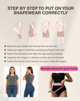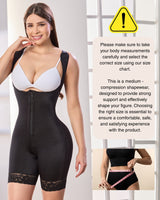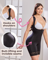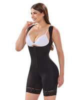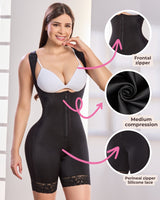Su diseño a media pierna con encaje antideslizante evita que la prenda se enrolle o se deslice fuera de lugar. Además, cuenta con ganchos en los hombros para un mejor soporte, cremallera frontal y cierre perineal, ofreciendo máxima comodidad durante todo el día.