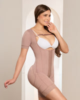 Cuenta con tres filas de broches frontales, lo que permite un ajuste personalizado y controlar los niveles de compresión según tus necesidades. Las mangas proporcionan mayor firmeza, mientras que la banda estabilizadora de pecho, removible y ajustable, ofrece un soporte óptimo y adaptable. Con cobertura total en la espalda y cierre perineal, esta faja combina funcionalidad y discreción en un diseño pensado para tu comodidad diaria.